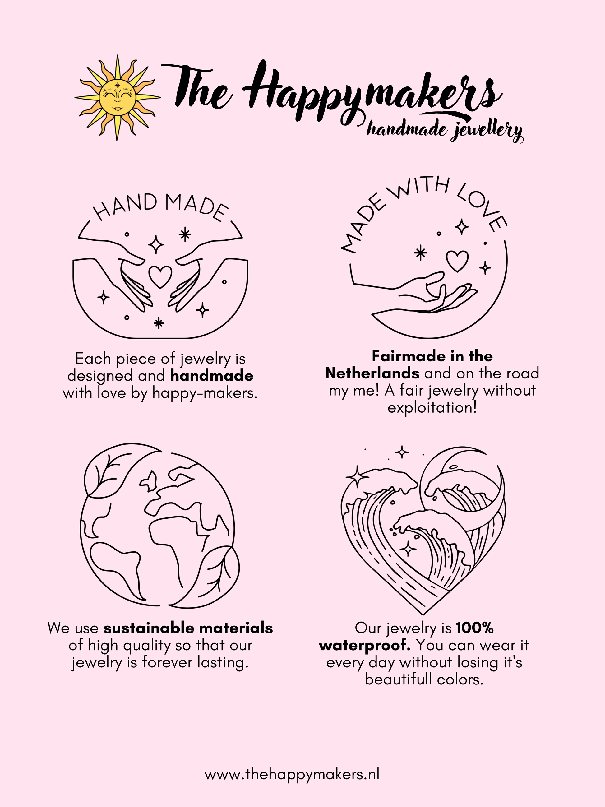 Elk sieraad wordt door ons zelf ontworpen en met de hand gemaakt door happy-makers in ons atelier in Nederland. Onze sieraden worden op een fairmade manier gemaakt zonder uitbuiting of kinderarbeid.