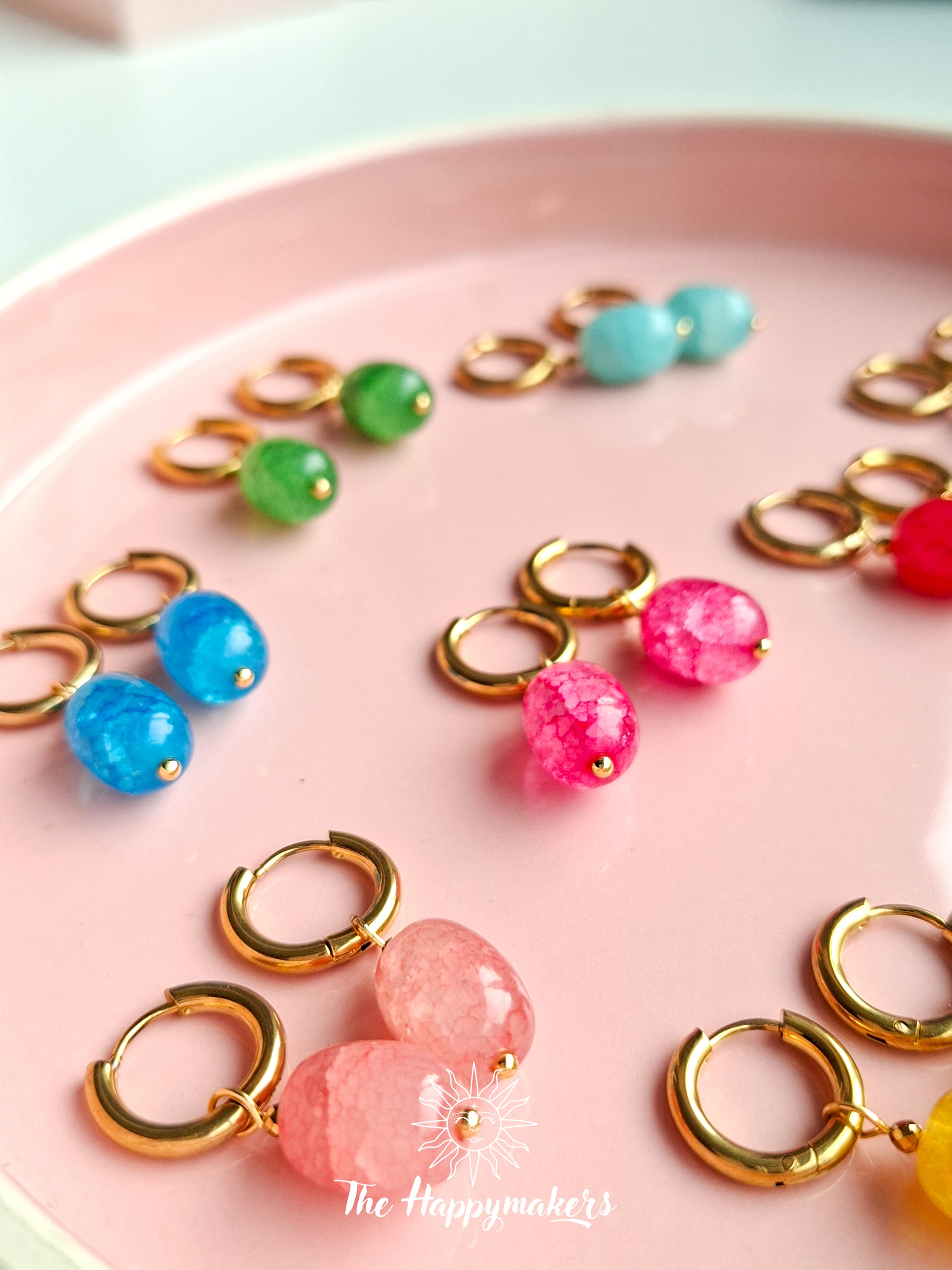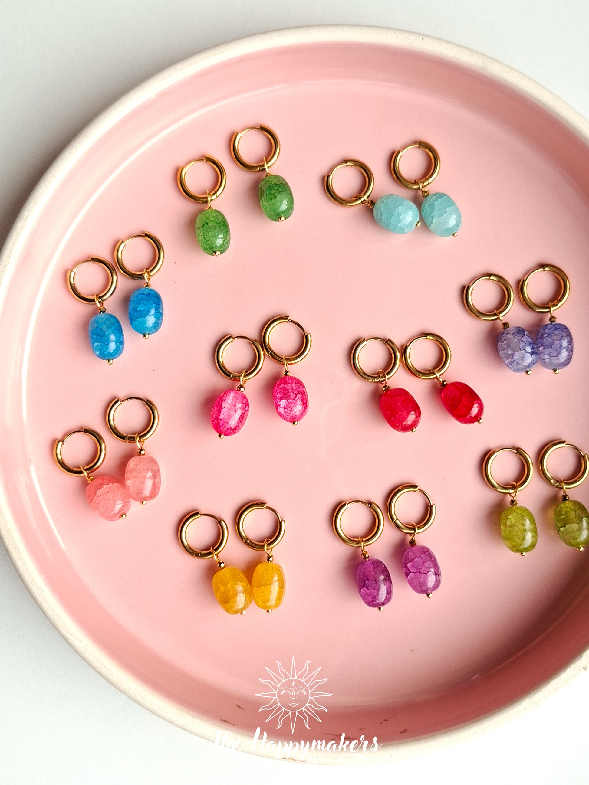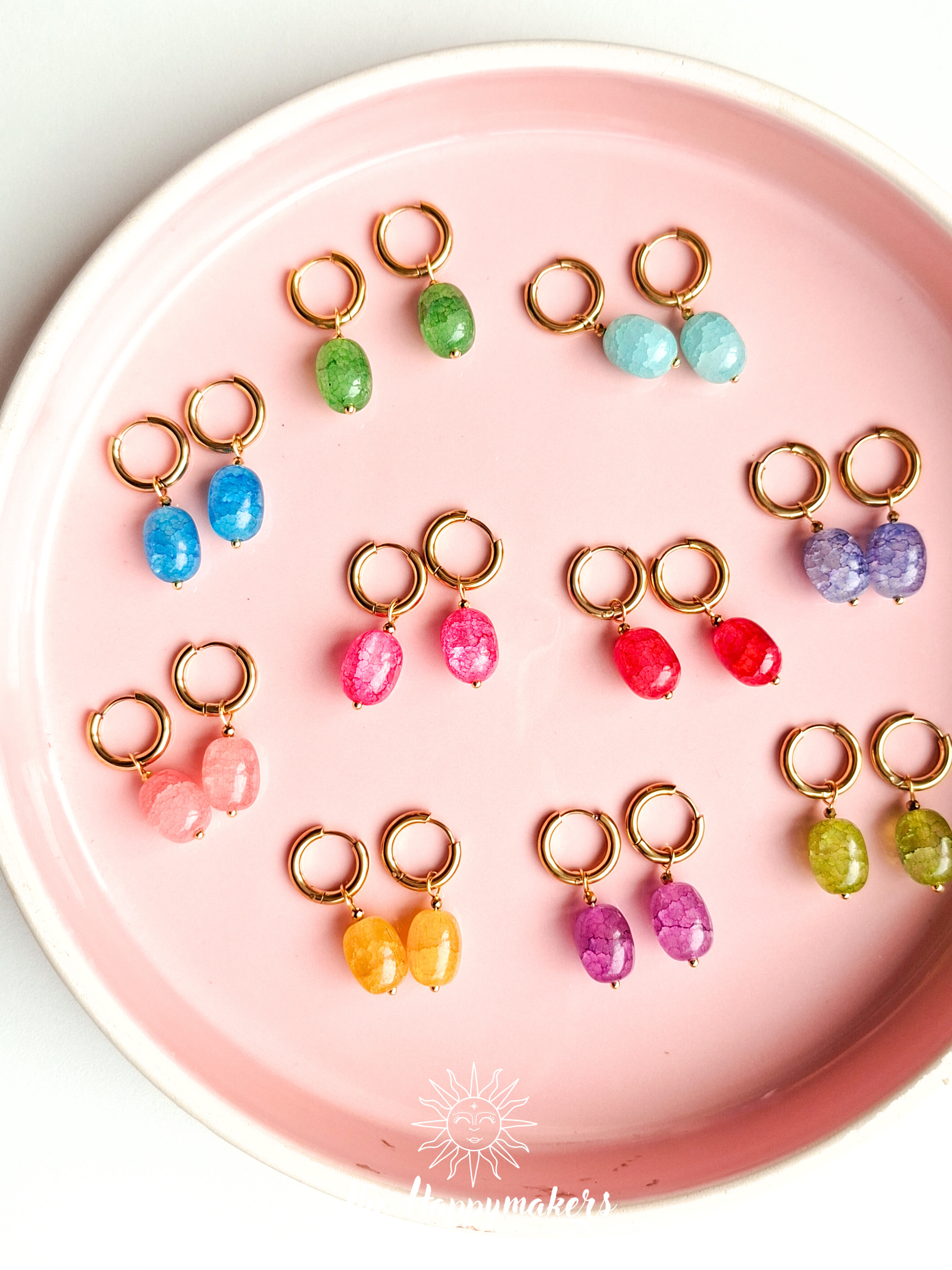 Oorbellen van grote glaskralen en stainless steel. Met de hand gemaakt in ons atelier. We gebruiken duurzame materialen die niet verkleuren zodat onze sieraden voor altijd mooi blijven.