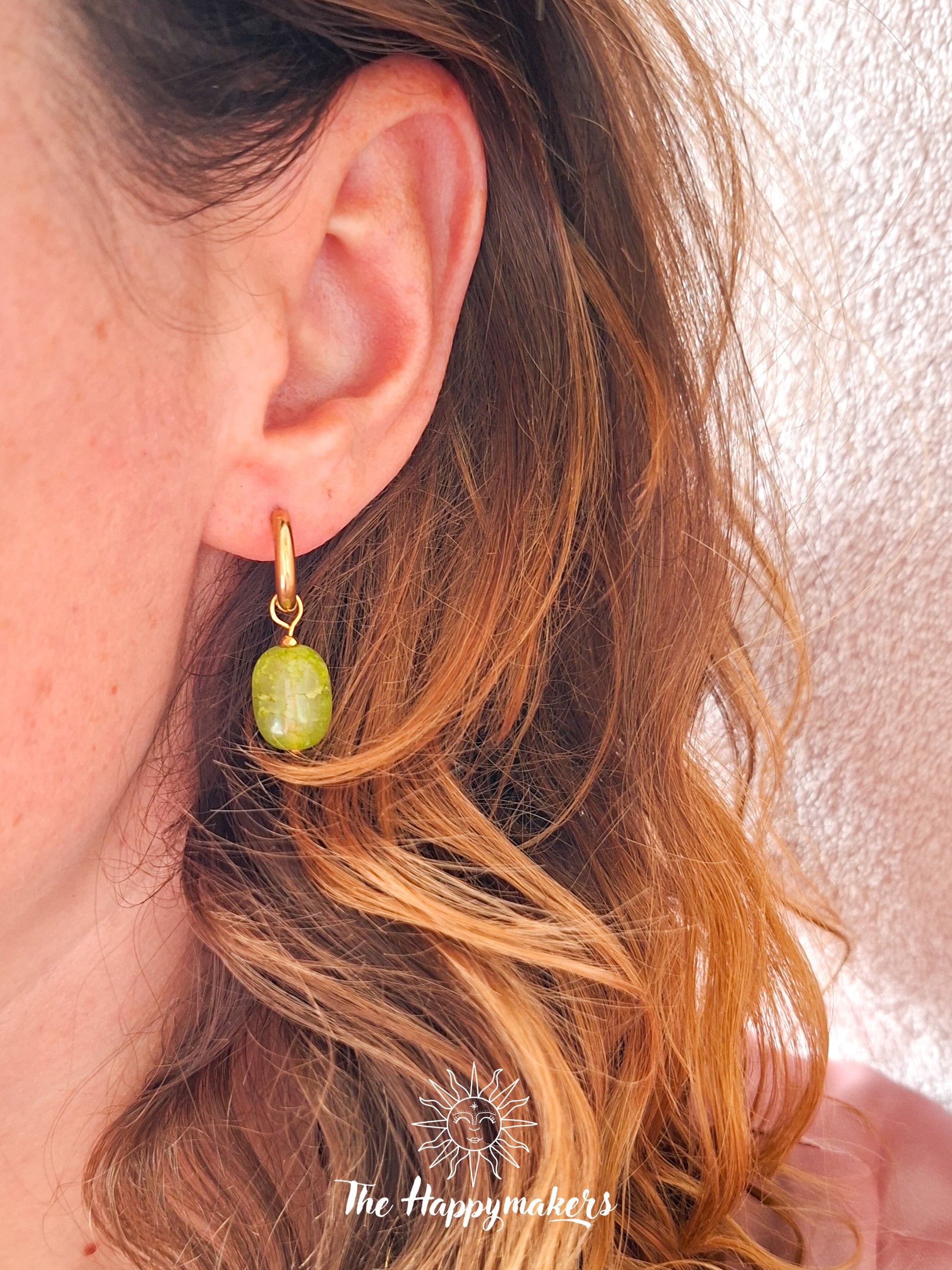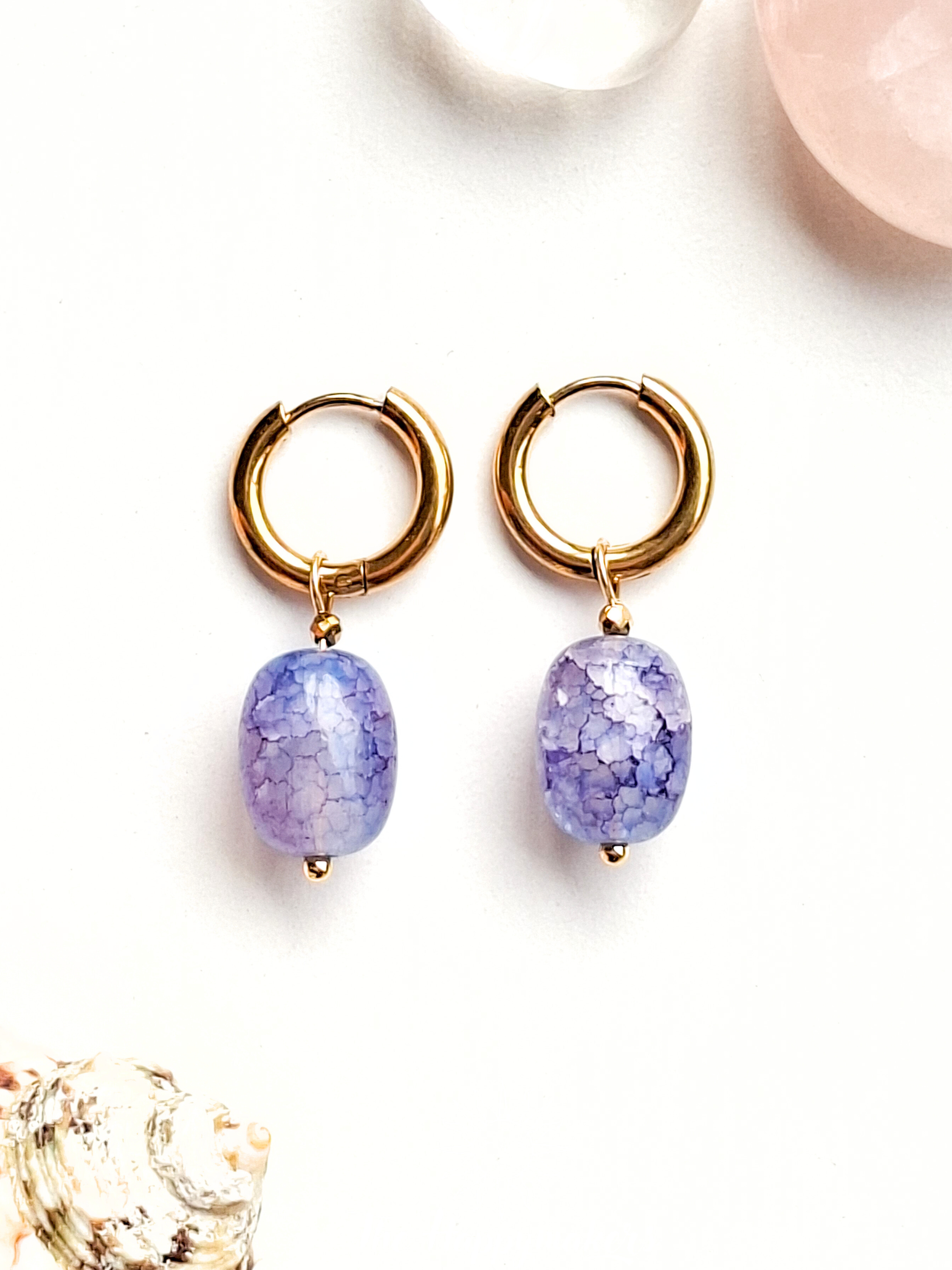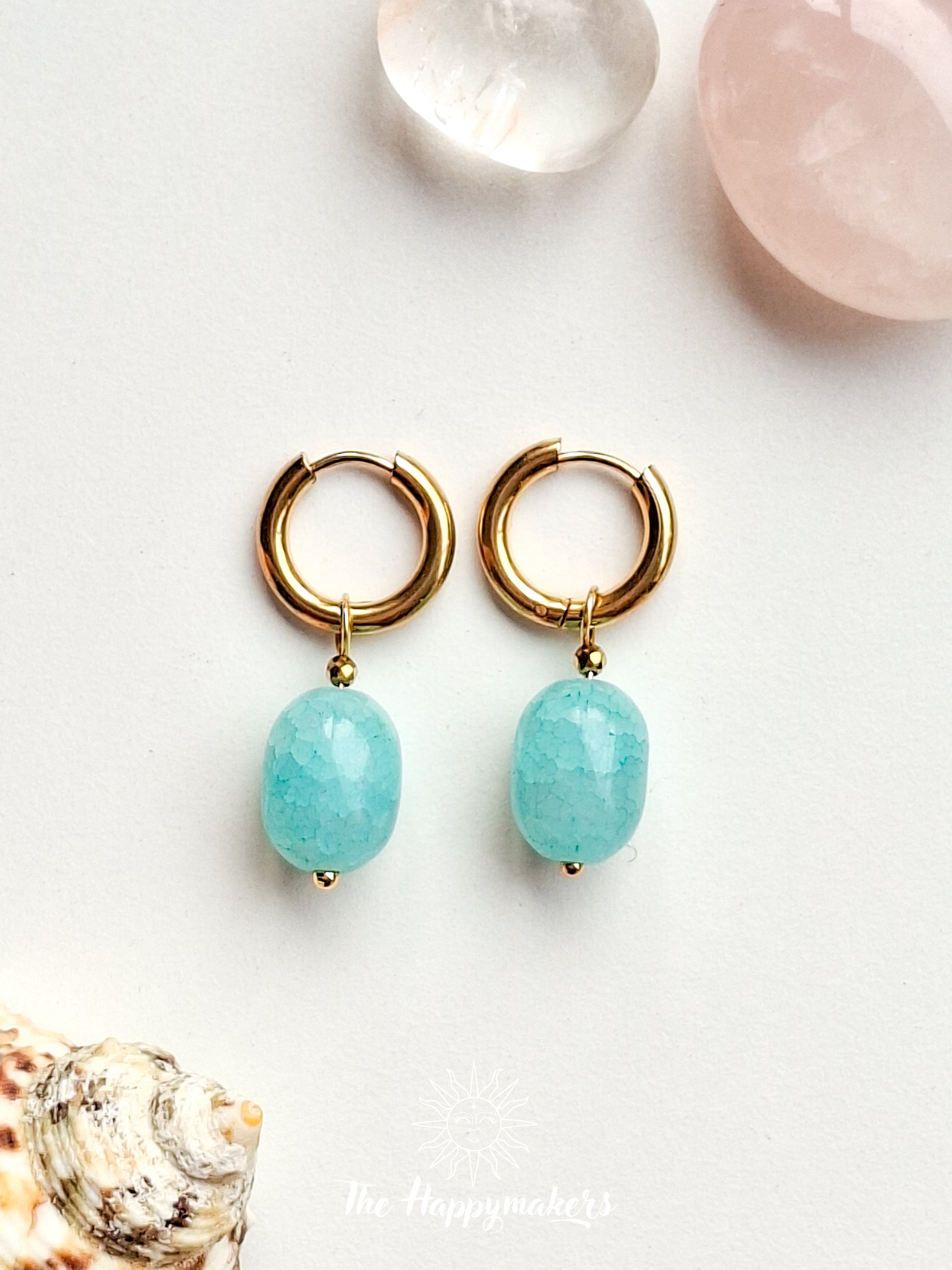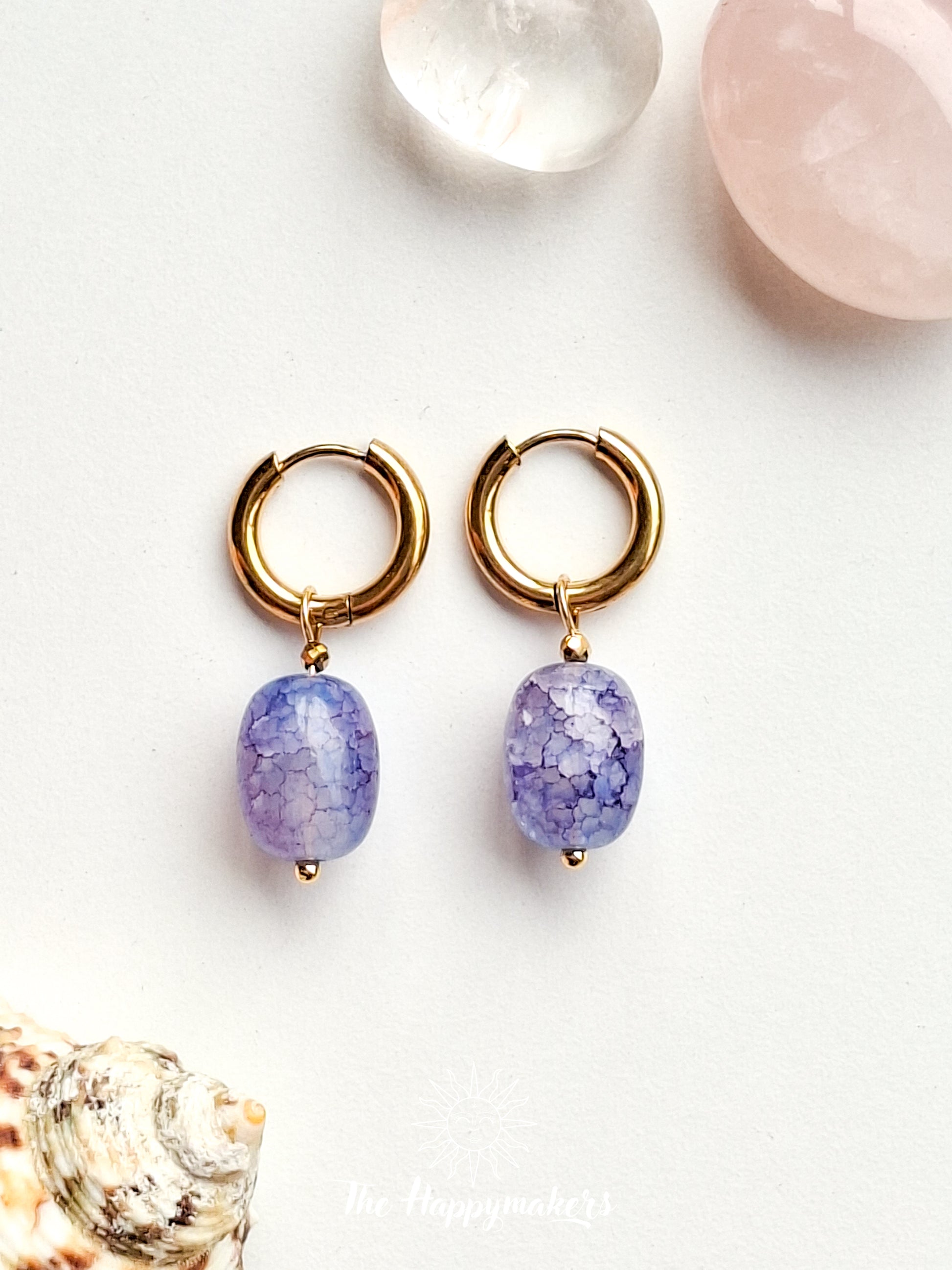 Oorbellen van grote glaskralen en stainless steel. Met de hand gemaakt in ons atelier. We gebruiken duurzame materialen die niet verkleuren zodat onze sieraden voor altijd mooi blijven.