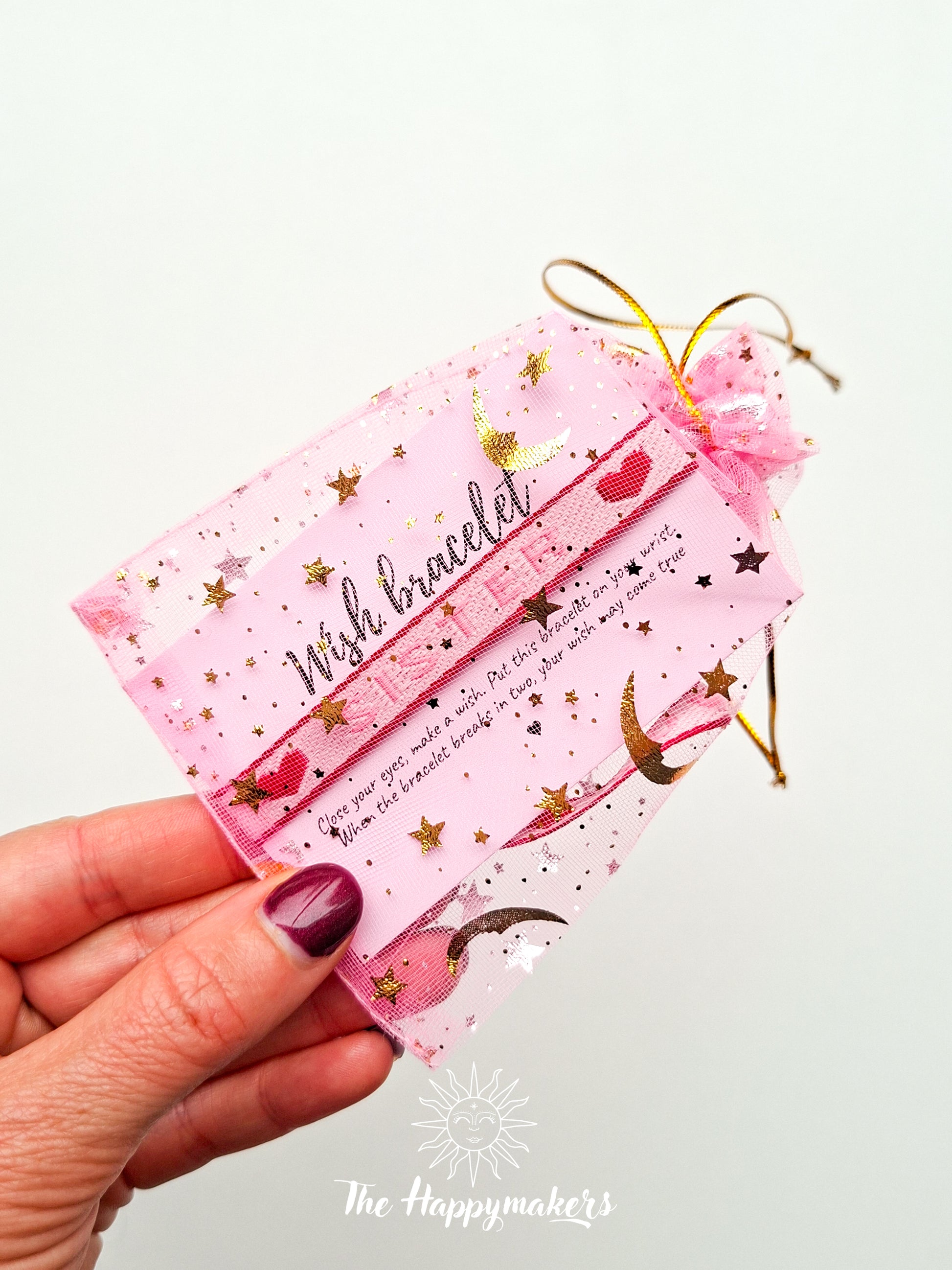 Wensarmband gemaakt van bohemian bloemen lint. Leuk als klein geschenk met een mooie boodschap. De armband zit aan een kaartje met de tekst ''Close your eyes, make a wish. Put this bracelet on your wrist. When the bracelet breaks in two, your wish may come true''. De bedoeling is dat je een wens doet, daarna het armbandje om knoopt en deze dag en nacht om laat zitten tot deze afvalt.